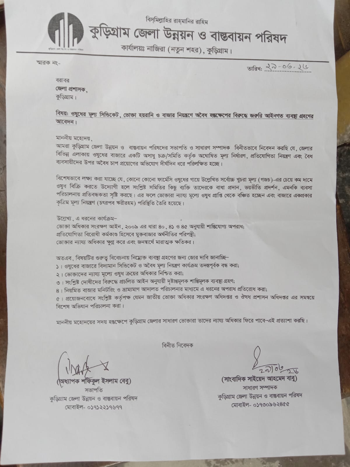 কুড়িগ্রাম জেলা উন্নয়ন ও বাস্তবায়ন পরিষদের সভাপতি অধ্যাপক শফিকুল ইসলাম বেবু ও সাধারণ সম্পাদক সাংবাদিক সাইয়েদ আহমেদ বাবু জেলা প্রশাসকের কাছে দেওয়া এক আবেদনে বলেন, একটি অসাধু চক্র দীর্ঘদিন ধরে ওষুধের বাজারে প্রতিযোগিতা নিয়ন্ত্রণ, অঘোষিত মূল্য নির্ধারণ এবং বৈধ ব্যবসায়ীদের ওপর অবৈধ চাপ প্রয়োগ করছে।