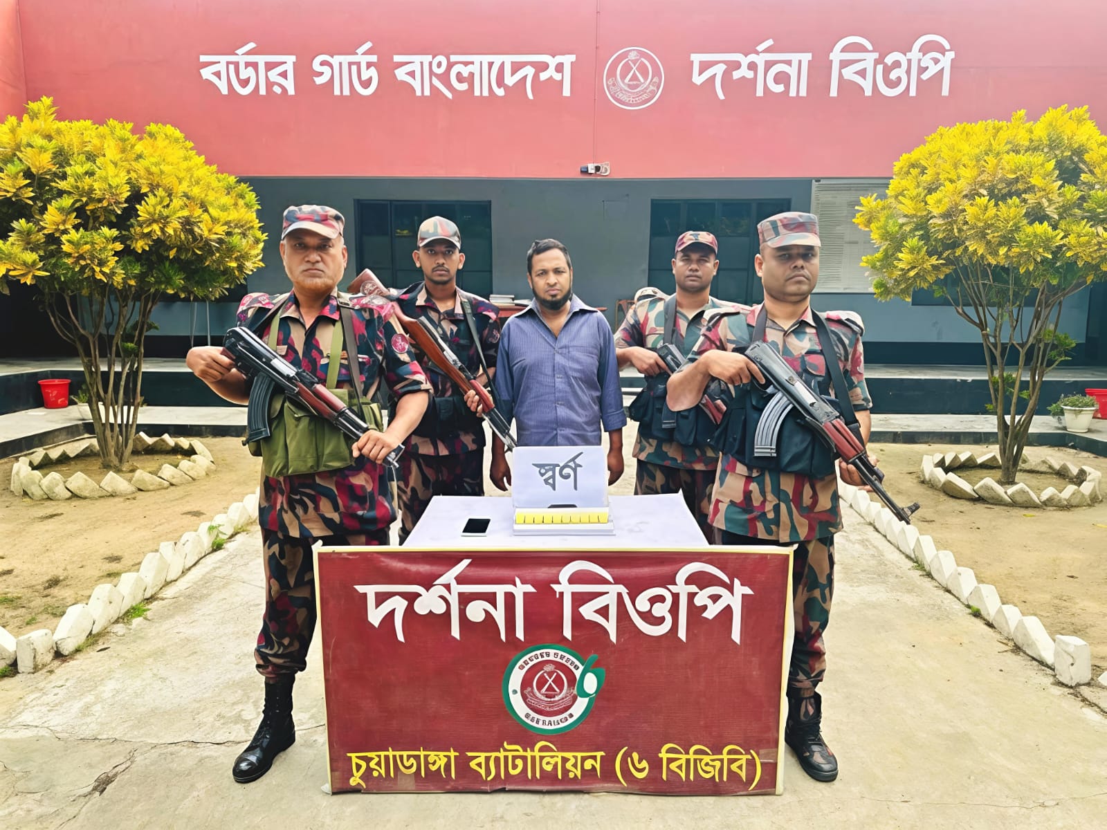 চুয়াডাঙ্গা বিশেষ প্রতিনিধিঃ———চুয়াডাঙ্গার দর্শনা সীমান্ত এলাকায় বর্ডার গার্ড বাংলাদেশ (বিজিবি) এক সফল অভিযান পরিচালনা করে বিপুল পরিমাণ স্বর্ণসহ এক চোরাকারবারিকে আটক করেছে। উদ্ধারকৃত স্বর্ণের বাজারমূল্য প্রায় আড়াই কোটি টাকা বলে নিশ্চিত করেছে বিজিবি কর্তৃপক্ষ।
